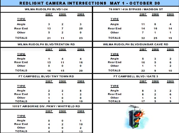 After their first six months of use, the red light cameras in Clarksville, Tennessee have failed to produce any reduction in the number of accidents. The city's first three cameras were installed May 1, and a comparison of accidents at these locations from May to the end of October compared to the same period in 2007 and 2008 shows that the total number of collisions jumped 22 percent following the installation of cameras.