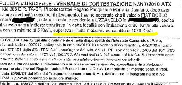 Italian tickets allow a five percent tolerance to account for the possibility of error. At 1230 km/h, the motorist exceeded the 90 km/h (56 MPH) speed limit with an adjusted velocity of 1078 km/h (669 MPH), according to the notice signed by two officers (view ticket). Oria police insist that the camera managed by the private firm Sodi Scientifica SpA is perfectly accurate. Officials blamed the incident "clerical error" in a statement issued Thursday.